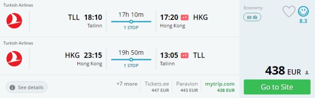 Turkish Airlinesi pakub lennupileteid Tallinnast Hongkongi hinnaga alates 438€. Pileteid on saada alates novembri algusest, kuni jõuludeni (k.a.) ja jälle alates jaanuarist 2017. a. Ümberistumiste pikkus Istanbulis sõltub lennupäevast. Kohati leiab ka kombinatsioone SAS-i ja Air China lendudest hinnaga al. 428€.