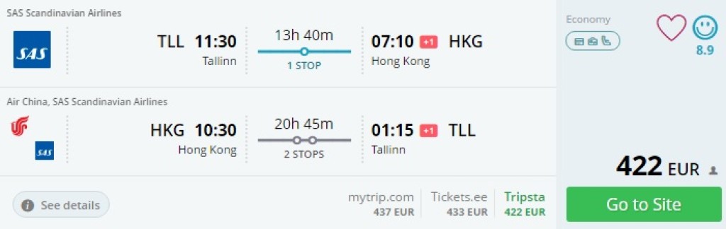 SAS ja China Airlinesi lendude kombinatsiooniga võib praegu leida lende Tallinnast Hongkongi hinnaga alates 422€. Tagasilend on üle Pekingi.