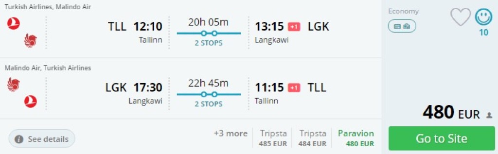 Turkish Airlines koostöös Malaisia lennufirmaga Malindo Air pakub soodsaid lende Tallinnast Malaisia puhkusesaarele Langkawile hinnaga al. 480€. Pileteid leiab alates septembrist kuni maini 2017 (v.a. jõulud ja aastavahetus). Saadavus on väga varieeruv, kohati sobivad igasugused kuupäevakombinatsioonid, kohati ei leia midagi. Ümberistumised on sinnalennul üldjuhul väga kiired, nii Istanbulis kui Kuala Lumpuris veidi üle tunni. Tagasilennul kipub olema pikem vahemaandumine Istanbulis, sel juhul võib soovitada pikema vahemaandumisega lennupäevi (15 h), mille puhul pakub Turkish Airlines tasuta ööbimist Istanbulis.