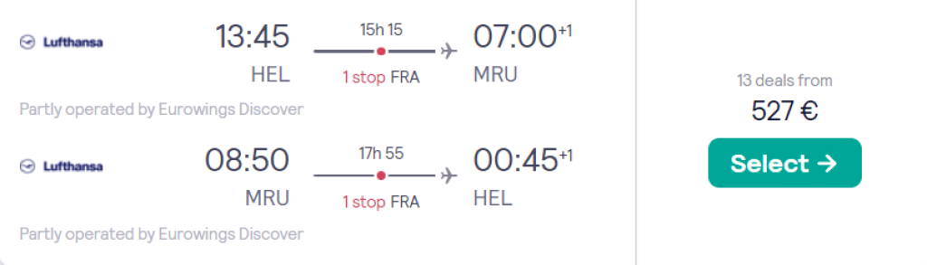 Lufthansa Grupi lennufirmad pakuvad hetkel hea hinnaga lennupileteid India ookeani saarele. Edasi-tagasi lennupiletid Helsingist Mauritiusele on saadaval alates 527€ eest. Hinna sees on nii äraantav pagas, kui ka toitlustamine lennukite pardal. Soodsa hinnaga lennupileteid leiab alates detsembrist kuni märtsini. Parima hinnaga lennupiletid leiab üles läbi Skyscanneri, aga meie soovitus on osta lennupiletid otse lennufirma kodulehelt Lufthansa.com.