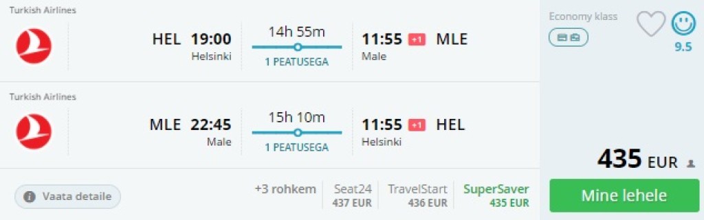 Turkish Airlines pakub hetkel väga hea hinnaga lennupileteid Helsingist Maldiividele. Edasi-tagasi lennupiletid on saadaval alates 435€ eest. Saadavust jagub aprillist augustini. Lennupiletid mõlemal suunal ühe mugava ümberistumisega Istanbulis. Soodsate lennupiletite ülesleidmiseks kasuta otselinke allpool või kontrolli endale sobivaid lennukuupäevi läbi momondo.