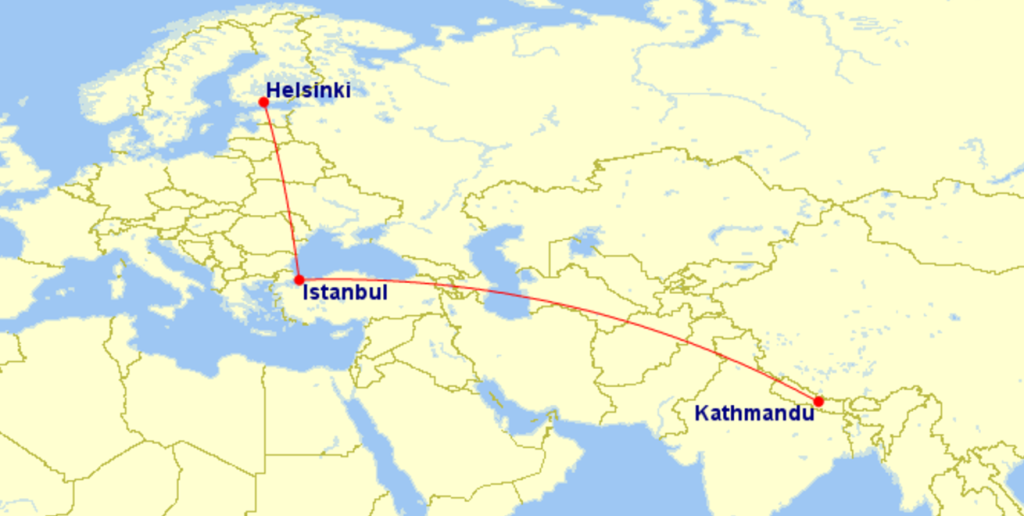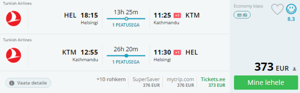 Turkish Airlines pakub hetkel väga hea hinnaga lennupileteid Helsingist Nepaali pealinna Katmandusse. Edasi-tagasi lennupiletite hinnad on alates 373€ ning lendudel on üks ümberistumine Istanbulis. Tagasitulles on 14 tunnine ümberistumine Istanbulis, aga kuna varasemat lendu Helsingisse pole, siis annab Turkish Airlines TASUTA ööbimise!