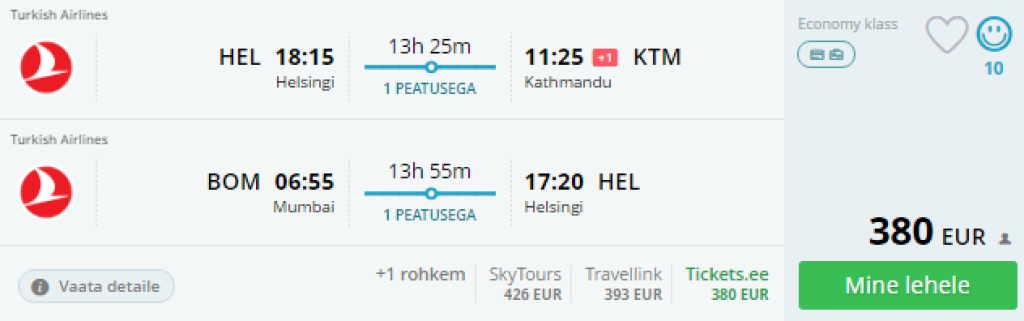 Helsingi-Katmandu-Helsingi 373€Tagasiteel on ümberistumine üle 10h, seega saate Turkish Airlinesilt tasuta ööbimise koos transfeeridega!