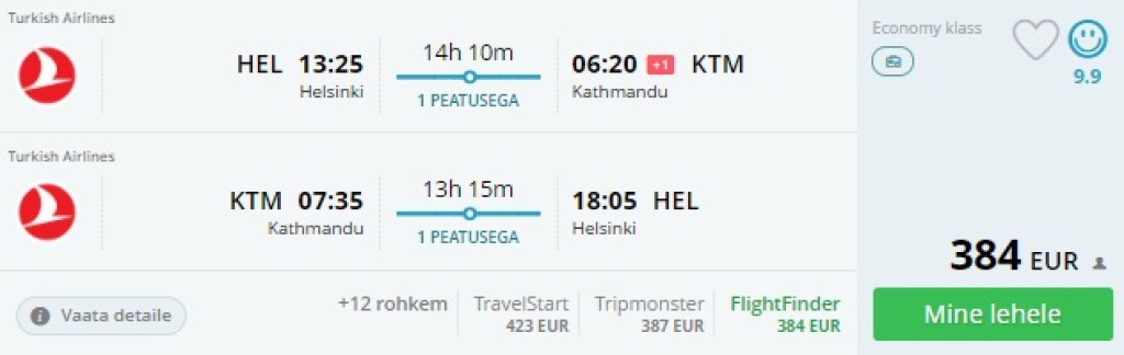 Turkish Airlines pakub hetkel väga hea hinnaga lennupileteid Helsingist Nepaali. Edasi-tagasi lennupiletid Helsingist Katmandusse on saadaval alates 384€ eest ning saadavust on mais-juunis ning septmebris- oktoobris. Soodsate lennupiletite ülesleidmiseks kasuta otselinke allpool või kontrolli endale sobivaid lennukuupäevi läbi momondo.ee