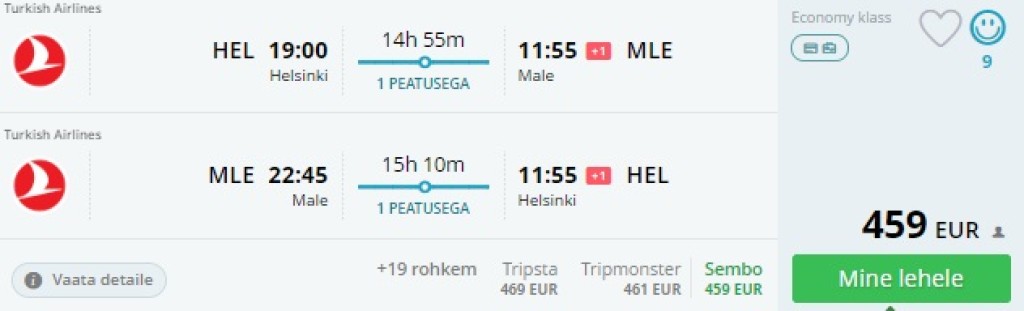 Turkish Airlines pakuvb hetkel väga hea hinnaga lennupileteid sügiseks Helsingist Maldiividele. Kiire ümberistumistega edasi-tagasi lennupiletid Helsingist Malesse on saadaval al 459€ eest. Soodsaima hinnaga lennupiletid leiad üles läbi Momondo.
