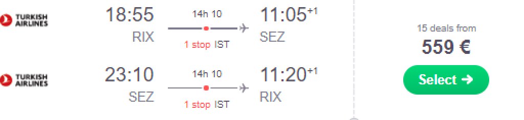 Turkish Airlines pakub hetkel hea hinnaga lennupileteid Seišellidele. Edasi-tagasi lennupiletid Riiast on saadaval 559€ eest ning saadaval ohtralt kuupäevi oktoobrist kuni aprillini 2020. Lennud on mõlemal suunal ühe kiire ümberistumisega Istanbulis. Tõime allpool välja valiku näidiskuupäevasid, kui nende hulgast endale sobivaid kuupäevi ei leia või soovid Seišellidel pikemalt olla, siis otsi endale sobivad lennupiletid üles läbi skyscanneri.