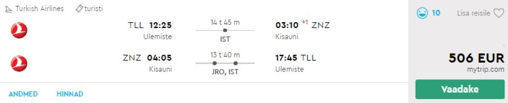 Turkish Airlines pakub soodsaid lennuvõimalusi Tallinnast Sansibarile, edasi-tagasi lennupiletite hinnad algavad 506 eurost. Saadaval on soodsaid lennukuupäevi aprillist juunini ning septembrist detsembrini. Endale sobivaid lennukuupäevi kontrolli läbi momondo.ee või kliki allolevatel näidiskuupäevadel.