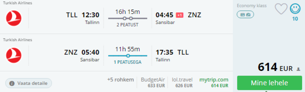 Turkish Airlines pakub soodsaid lennupileteid Tallinnast Sansibarile. Pileteid on saada alates märtsi lõpust kuni juunini. Edasi- tagasi lennupiletite hinnad on al 614€. Lennupiletid leiad üles otselinkide kaudu allpool või läbi momondo.