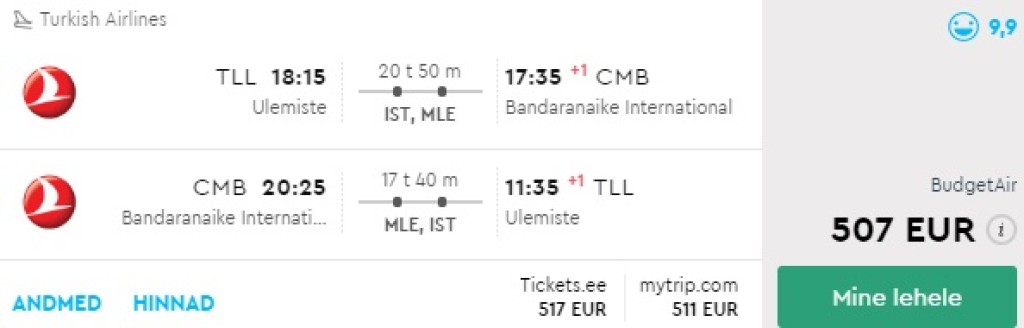 Turkish Airlinesil on hetkel broneeritavad väga hea hinnaga lennupiletid Tallinnast Sri Lankale! Edasi-tagasi lennupiletid on saadaval alates 507€ eest. Valikus on ohtralt soodsaid lennukuupäevi oktoobrist kuni märtsini. Piletiteni jõudmiseks kliki allolevatel näidiskuupäevadel või kontrolli endale sobivaid lennukuupäevi läbi momondo.ee.