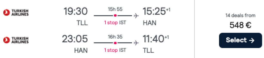 Turkish Airlines pakub hetkel väga hea hinnaga lennupileteid Vietnamisse. Edasi-tagasi lennupiletid Tallinnast pealinna Hanoisse on saadaval alates 543€ eest. Lendudel on mõlemal suunal üks ümberistumine Istanbulis.