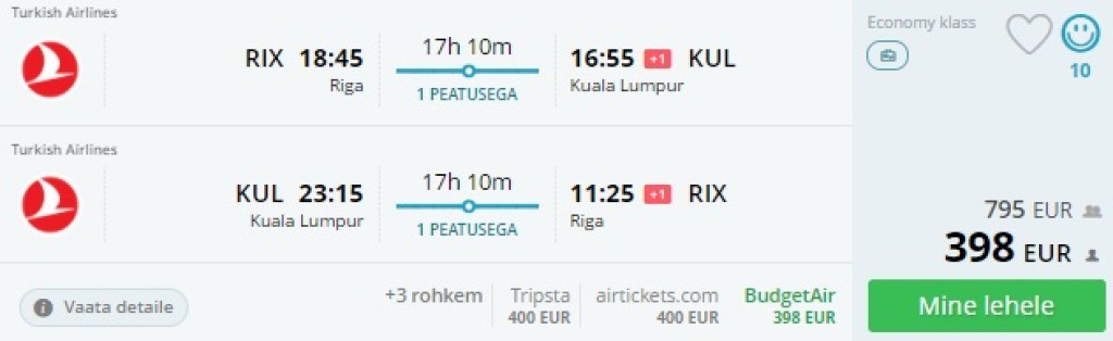 Kvaliteetne Turkish Airlines pakub hetkel väga hea hinnaga mugavaid lennuühendusi Riiast Malaisia pealinna, Kuala Lumpurisse. Edasi-tagasi lennupiletid on saadaval alates **398€ **eest ning saadavus on üheksa- või kümnepäevasteks reisideks mais-juunis. Lennupiletiteni jõudmiseks kliki allolevatel näidiskuupäevadel või kontrolli endale sobivaid lennukuupäevi läbi momondo.