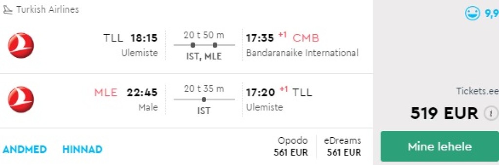 Turkish Airlinesil on hetkel broneeritavad väga hea hinnaga lennupiletid Tallinnast Maldiividele ja Sri Lankale! Edasi-tagasi lennupiletid on saadaval alates 507€ eest. Valikus on ohtralt soodsaid lennukuupäevi oktoobrist kuni märtsini. Piletiteni jõudmiseks kliki allolevatel näidiskuupäevadel või kontrolli endale sobivaid lennukuupäevi läbi momondo.ee.