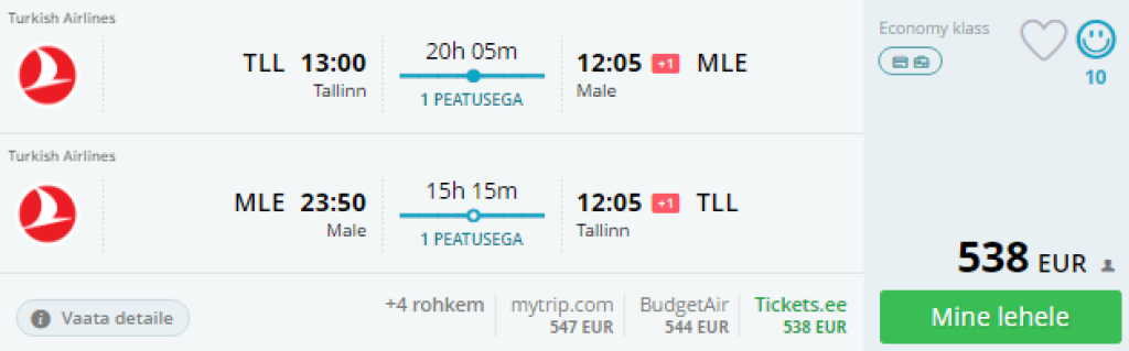 Turkish Airlines pakub lennupileteid Tallinnast Maldiividele. Pileteid on saada alates novembrist kuni märtsini. Lennud on ühe ümberistumisega Istanbulis. Edasi- tagasi lennupiletite hinnad on al 538€. Mõningad lennukuupäevad kiire ümberistumisega mõlemal suunal, mõningate puhul tuleb minnes veeta 9h Istanbulis (ööbimine pole vajalik!). Lennupiletid leiad üles otselinkide kaudu allpool või läbi momondo.