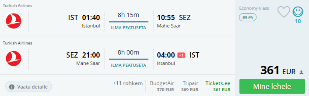 Turkish Airlines pakub soodsaid lennupileteid Istanbulist Seišellidele! Edasi- tagasi lennupiletid saadaval alates 361€ eest. Tegemist on otselendudega ning saadaval on lennukuupäevi juulist oktoobrini. Soodsad lennupiletid leiad läbi momondo või kasutades otselinke allpool. Sinna juurde saad soetada Turkish Airlinesi otselennud Tallinnast Istanbuli hinnaga al 188€. Sellisel moel saad lennata edasi- tagasi Tallinnast ühe ümberistumisega Seišellidele hinnaga al 549€.