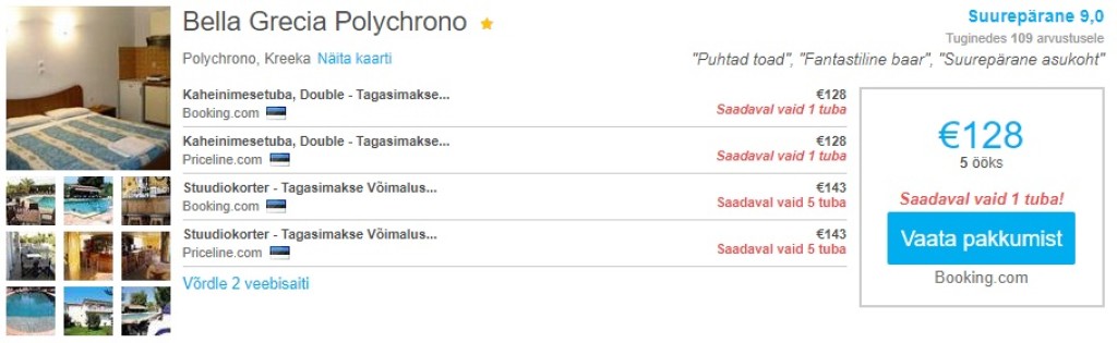 HotellidParima hinnaga hotellipakkumised igale maitsele leiad läbi hotellihindade võrdlusportaali Hotelscombined.ee. Järgnevalt näide heade reitingutega soodsast hotellipakkumisest vahemikus 05.10-10.10. Sobivad lennupiletid leiad SIIT.