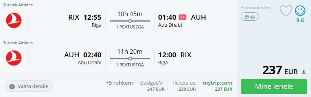 Turkish Airlines pakub talvel soodsaid pileteid lendudele Riiast Abu Dhabisse. Väljalendudele alates 10. jaanuarist kuni märtsi keskpaigani on edasi-tagasi lennupileteid saada hinnaga 237-238€. Kiirete ühendustega lennud leiab, kui vaadata väljumisi nii Riiast kui Abu Dhabist E, K, R. Väljalennuks on sageli siiski parim päev kolmapäev, tagasilendude valik on parem.