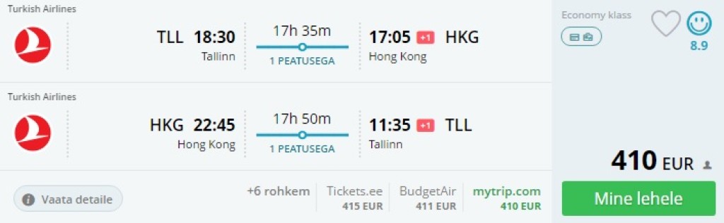 Turkish Airlines pakub lennupileteid Tallinnast Hongkongi hinnaga 410€. Teoorias on saadavust kuni 2018. a. 21. oktoobrini, reaalselt on saadavus piiratud arvul kuupäevadel jaanuarist aprillini. Sõltuvalt kuupäevast on lendudel ümberistumised Isanbulis eri pikkusega, kuid saadaval on ka mugavalt kiirete ümberistumistega lennud. Müügiperiood on kuni 31. oktoobrini. Minimaalne kohaloleku aeg on 3 päeva või pühapäevane päev, maksimaalne 3 kuud.