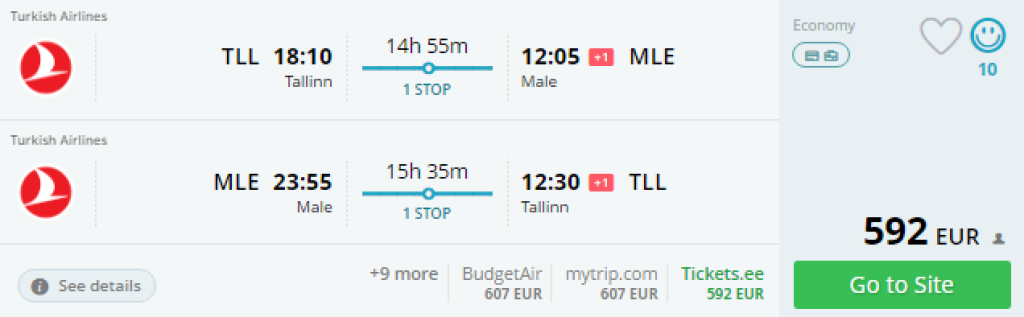 Turkish Airlines pakub soodsaid lennupileteid Tallinnast või Riiast Maldiividele, Malesse hinnaga alates 531€. Lennud on ühe suhteliselt kiire ümberistumisega Istanbulis ning saadavus on hea september kuni jaanuar(ka. aastavahetus ja jõulud). Soodsad lennupiletid leiad läbi momondo või kasuta otselinke allpool.