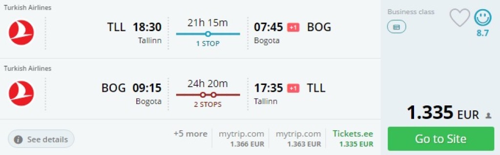 Turkish Airlines pakub äriklassi pileteid Bogotasse ja Panama Citysse hinnaga 1335€. Pileteid on saada aasta läbi, s.h. ka jõuludeks ja aastavahetuseks. Võrreldes turistiklassi hindadega on tegemist väga soodsa pakkumisega, sest äriklassi piletid on küllalt pika lennu puhul turistiklassi hetkehindadest vaid 400-500 eurot kallim. Äriklassi lendude eest saadavaid lennumiile saab kasutada mõne Star Alliance’i kuuluva lennufirma piletite soetamiseks või teenuseklassi tõstmiseks (upgrade).