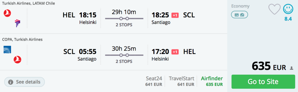 Turkish Airlines koostöös Copa Airlinesi ning LATAM Chilega pakuvad hetkel väga hea hinnaga lennupileteid Helsingist Tšiili pealinna Santiagosse. Edasi- tagasi lennupiletite hinnad on saadaval 635€ eest. Lennud on kahe ümberistumisega mõlemal suunal ning saadavust jagub alates novembrist kuni maini (v.a jõulud ja aastavahetus). Hinna sees on lisaks käsipagasile ka äraantav pagas. Kuna Tšiili asub lõunapoolkeral, siis meie jaoks talvel on seal suvi. See on ka parim aeg külastada näiteks Patagooniat, mis asub Tšiili lõunaosas. Suuremate Tšiili linnade vahel lendab ka odavlennufirma Sky Airlines, kust saab siis soetada mõistlike hindadega lennupiletid.