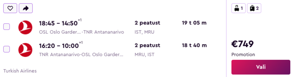 Turkish Airlines pakub hetkel hea hinnaga lennupileteid Madagaskarile. Edasi-tagasi lennupiletid Oslost Madagaskari pealinna Antananarivosse on saadaval alates 749€ eest. Lennud on mõlemal suunal kiirete ümberistumistega.