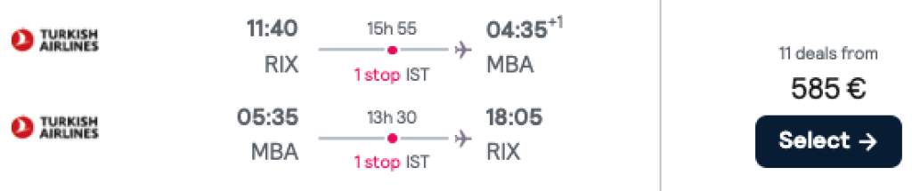 Turkihs Airlines avab sügisel uue liini Istanbulist India ookeani äärsesse Keeniasse ning pakub hetkel ka hea hinnaga lennupileteid algusega Riiast. Kiirete ümberistumistega edasi-tagasi lennupiletid Riiast Mombasasse on saadaval alates 585€ eest.