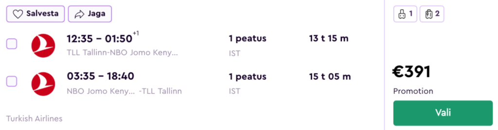 Turkish Airlines pakub suurepärase hinnaga lennupileteid Keeniasse. Ühe kiire ümberistumisega edasi-tagasi lennupiletid Tallinnast Nairobisse on saadaval alates 391€ eest.