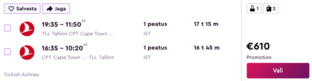 Turkish Airlines pakub hetkel suurepärase kampaaniahinnaga lennupileteid Lõuna-Aafrika Vabariiki. Edasi-tagasi lennupiletid Tallinnast Johannesburgi ja Kaplinna on saadaval alates 524€ eest.