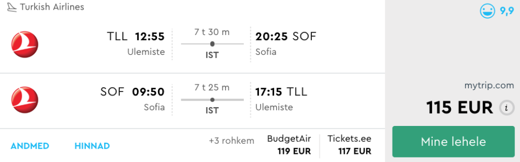Turkish Airlines pakub hetkel väga hea hinnaga lennupileteid Bulgaariasse. Edasi-tagasi lennupiletid Tallinnast Bulgaaria pealinna Sofiasse on saadaval vaid 115€ eest. Saadavust leiab alates oktoobrist ning kuni veebruari lõpuni (viimane võimalik väljalend 28.02 ja tagasilennu leiab ka märtsisse). Lennud on ühe kiire ümberistumisega Istanbulis ning lennupiletite hinna sees on nii äraantav pagas kui toitlustamine Turkish Airlinesi pardal. Parima hinnaga lennupiletid leiad üles läbi Momondo.ee või klikkides allolevatel näidiskuupäevadel.
