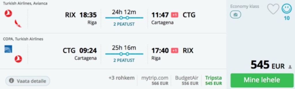 Teised lennukuupäevad leiad: [Edasi-tagasi lennupiletid Riiast Kolumbiasse alates 545€](https://trip.ee/odavad-lennupiletid/edasi-tagasi-lennupiletid-riiast-kolumbiasse-alates-545)