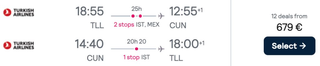 Turkish Airlines pakub hetkel hea hinnaga lennupileteid Mehhikosse. Kiirete ümberistumistega edasi-tagasi lennupiletid Tallinnast Cancuni on saadaval alates 679€ eest. Lendudel on mõlemal suunal ümberistumine Istanbulis.
