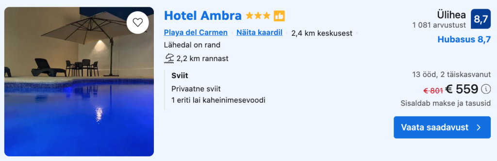 Toome ka välja näite, kuidas saab ise broneerides kahenädalase reisi Mehhikosse kätte vaid 969€ eest (reisides kahekesi). Hinnas sisalduvad Turkish Airlinesi lennupiletid koos äraantava pagasiga algusega Tallinnast ning privaatne sviit Playa del Carmenis (13 ööd).