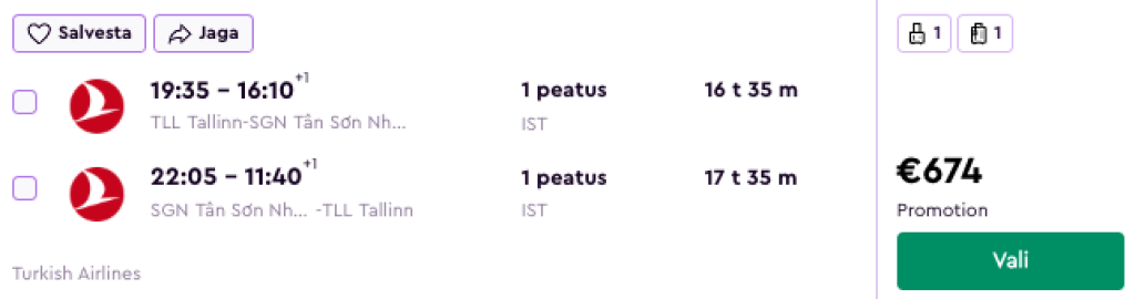 Turkish Airlines pakub suurepärase hinnaga lennupileteid Vietnami. Ühe ümberistumisega edasi-tagasi lennupiletid Tallinnast Ho Chi Minh Citysse on saadaval alates 668€ ja Riiast alates 577€ eest.