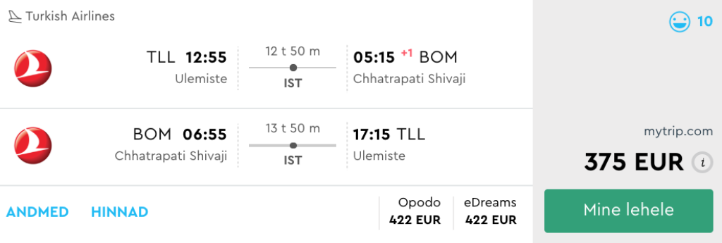 Teised lennukuupäevad leiad: [Edasi-tagasi lennupiletid Tallinnast Indiasse 375€](https://trip.ee/odavad-lennupiletid/turkish-airlines-indiasse-edasi-tagasi-lennupiletid-tallinnast-mumbaisse-al-375)