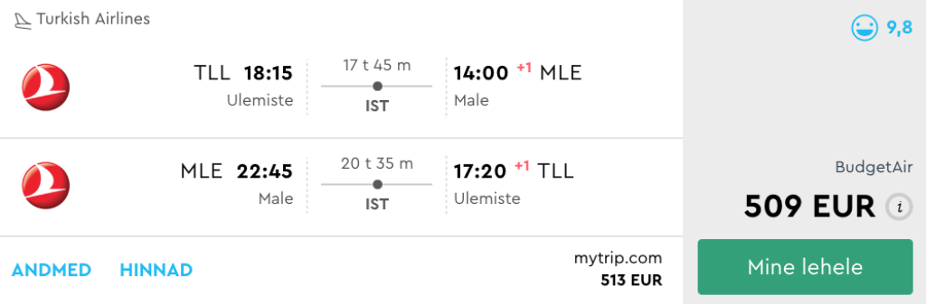 Teised lennukuupäevad leiad: [Edasi-tagasi lennupiletid Tallinnast Sri Lankale 507€](https://trip.ee/odavad-lennupiletid/turkish-airlines-edasi-tagasi-tallinnast-maldiividele-al-509-sri-lankale-al-507-valikus-ka-open-jaw-piletid)