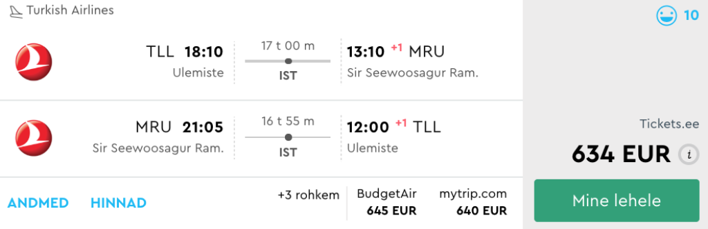 Teised lennukuupäevad leiad: [Edasi-tagasi lennupiletid Tallinnast Mauritiusele 634€](https://trip.ee/odavad-lennupiletid/edasi-tagasi-lennupiletid-suegisel-ja-talvel-tallinnast-mauritiusele-alates-636)