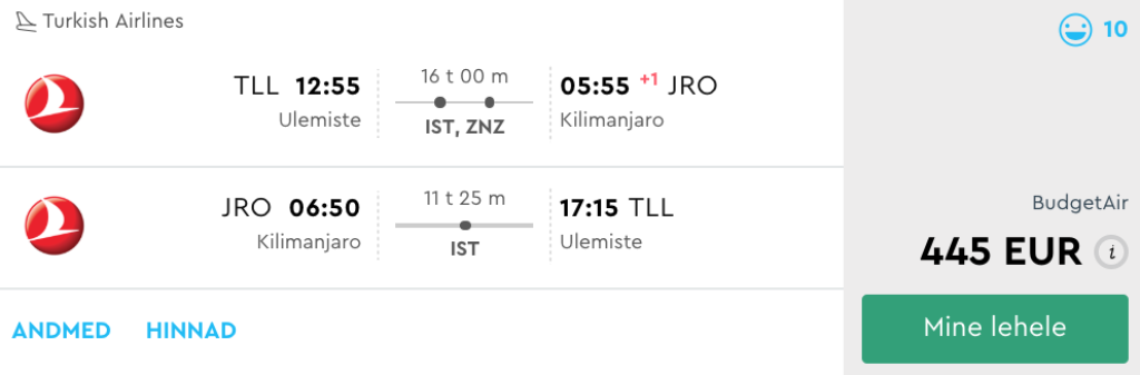 Teised lennukuupäevad leiad: [Edasi-tagasi lennupiletid Tallinnast Kilimanjarosse 445€](https://trip.ee/odavad-lennupiletid/edasi-tagasi-lennupiletid-tallinnast-kilimanjarosse-vaid-445)