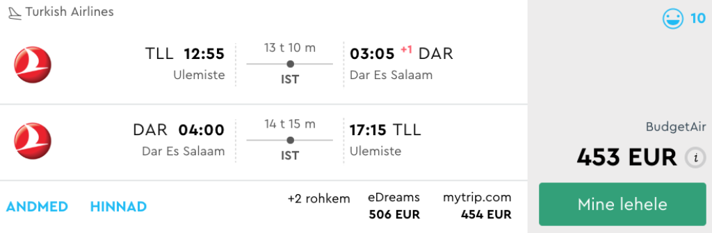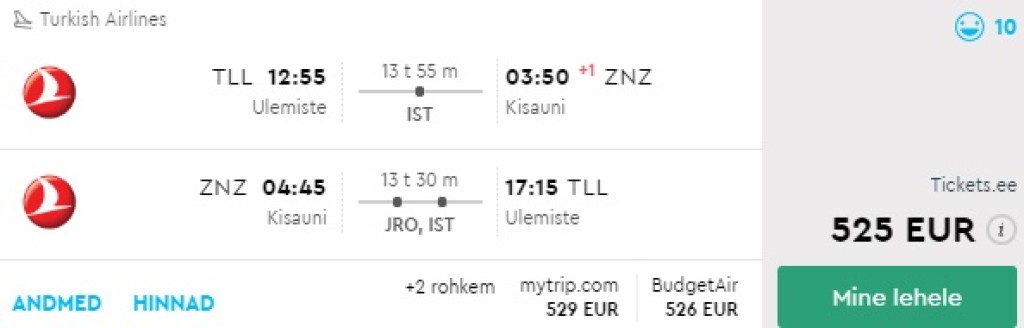 Teised lennukuupäevad leiad: [Turkish Airlines: edasi-tagasi lennupiletid Tallinnast Sansibarile al 526€](https://trip.ee/odavad-lennupiletid/turkish-airlines-edasi-tagasi-lennupiletid-tallinnast-sansibarile-al-526)