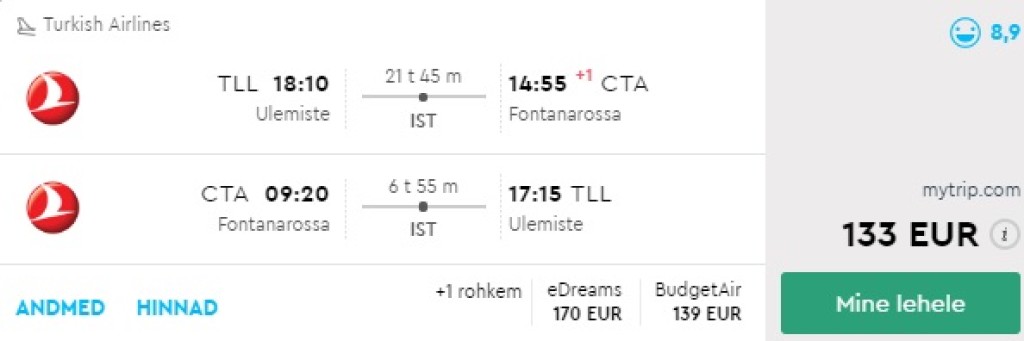 Viimastel nädalatel nädalal on Turkish Airlines üllatanud väga soodsate lennupiletitega paljudesse sihtkohtadesse Euroopas (hinnad al 115€), Aafrikas (hinnad al 178€) ja Aasias (al 375€). Valikus on olnud paljud Euroopa linnad ning saadaval on enamasti suurepärane valik soodsaid lennukuupäevi oktoobrist kuni märtsini 2019.Vaatasime kõik sihtkohad üle ning soodsaid lennupileteid on endiselt veel võimalik leida. Allpool oleme välja toonud hinnanäite kõikidesse linnadesse ning otselingi pakkumise juurde.Soodsate lennupiletite ülesleidmiseks kasuta linke allpool või kontrolli endale sobivaid lennukuupäevi läbi momondo.ee.
