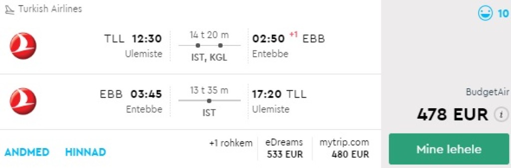 Teised lennukuupäevad leiad: [Turkish Airlines: edasi-tagasi lennupiletid Tallinnast Ugandasse al 477€](https://trip.ee/odavad-lennupiletid/turkish-airlines-edasi-tagasi-lennupiletid-tallinnast-ugandasse-al-477)
