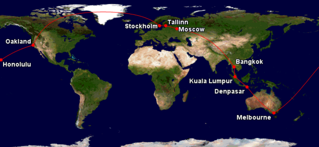 Panime kokku lennupiletid ümbermaailmareisiks alguse ja lõpuga Tallinnas hinnaga 1118€. Reis vahemikus 07.11-01.01, seega on reisikuupäevade hulgas on ka jõulud ja aastavahetus. Enamike väljaotsitud lenude puhul on tegemist otselendudega. Lennupiletid soeta läbi Momondo.com või kasuta otselinke allpool.
