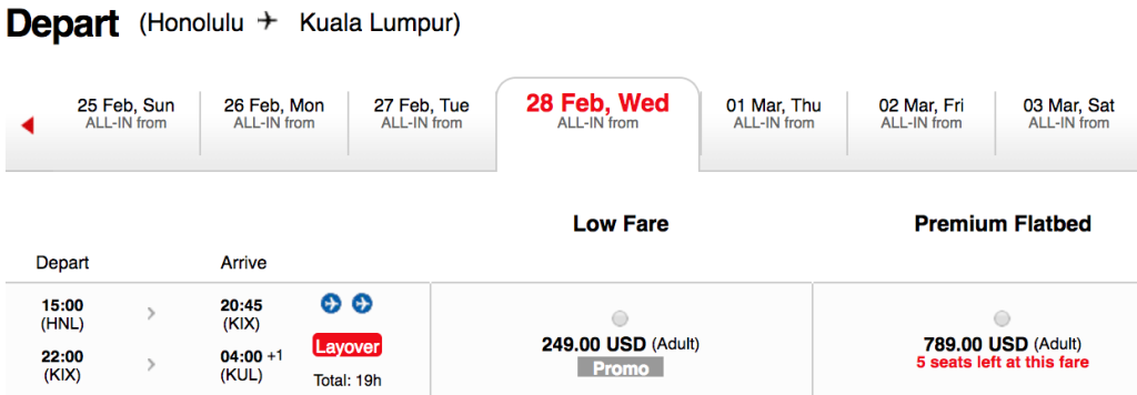 Honolulu-Kuala Lumpur 213€ (249USD)Soodsaimad lennupiletid leiab üles AirAsia kodulehelt.