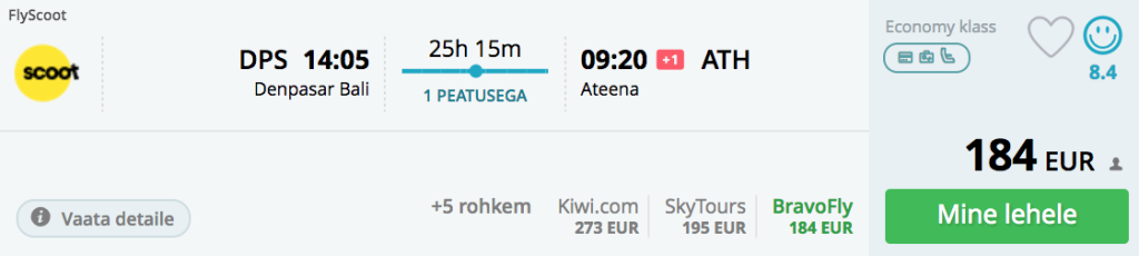 Denpasar(Bali)-Ateena 184€Lennud Balilt tagasi Euroopasse on soodsaimad Singapore Airlinesile kuuluva odavlennufirma Scootiga. Lendudel on ümberistumine Singapuris. Leidub ka teisi kuupäevi.