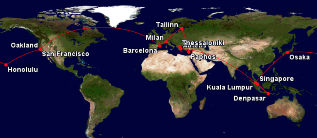 Toome tripikateni näite, kuidas saab veebruaris ning märtsis maakerale tiiru ümber teha erinevaid odavlennufirmasi kasutades vaid 842€ eest. Külasta ühel reisil suurlinnu Barcelonat, San Franciscot, Kuala Lumpurit ning Ateenat ja puhka Hawaiil, Balil, Kreekas ning Küprosel vaid 910€ eest. Tegemist on puhtalt näidispakkumisega, ning kuupäevad on muudetavad. Meie poolt tehtud näidisreisi vahemik on 30.01-24.03.2018.