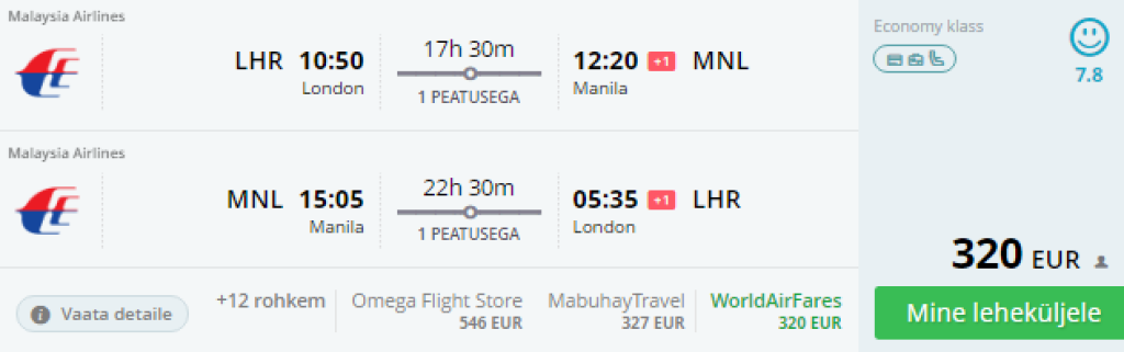 Kiirematele ! Hetkel saadaval väga soodsad lennud Londonist Filipiinidele, Manilasse 320€. Lend on ühe vahe maandumisega Kuala Lumpuris. Saadavus oktoober kuni aprill.