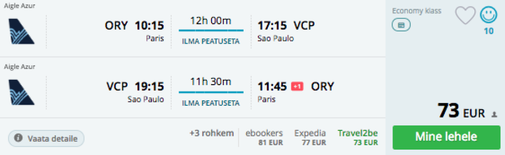 Aigle Azur pakub hetkel edasi-tagasi lennupileteid suveks Pariisist Brasiiliasse vaid 73€ eest. Lennud toimuvad Pariisi Orly lennujaamast ning maanduvad Campinase linna, mis asub Sao Paolo lähistel.Huvi korral tegutse kiirelt, sest selline pakkumine kaua ei kesta!