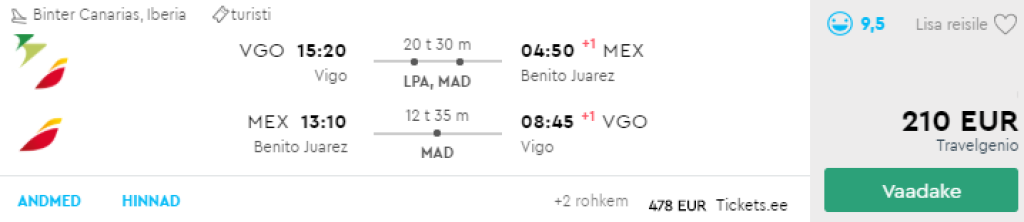 Hetkel on leitavad veahinnad Hispaaniast (Vigo) Mexico Citysse. Edasi-tagasi lennupiletid on saadaval al 210€ eest märtsis-aprillis ning oktoobris-novembris. Käsipagasiga lendajad võiksid kaaluda tagasiteel viimase lennusegmendi kasutamata jätmist ja lennata tagasi koju Madridist. Lennupiletite ostmiseks kliki allpool olevatel näidiskuupäevadel või otsi endale sobivaid lennukuupäevi läbi Momondo.ee