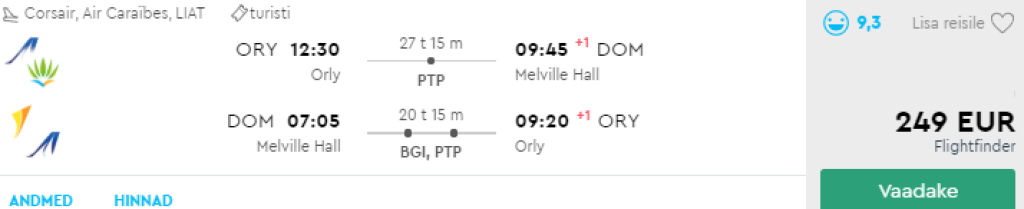 Hetkel on leitavad veahinnaga lennupiletid Pariisist Kariibi meres asuvale Dominica saarele. Edasi-tagasi lennupiletid on saadaval al 249€ eest ning saadaval on lennukuupäevi märtsist juunini, Endale sobivaid lennukuupäevi kontrolli läbi momondo.ee või kliki allolevatel näidiskuupäevadel.