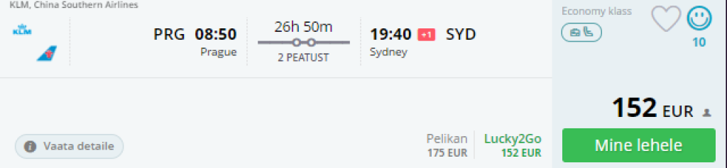 Hetkel on leitavad veahinnaga üheotsa lennupiletid sügiseks Prahast Austraaliasse alates 140€ eest. Eriti võiks nende piletite soetamist kaaluda noored, kes plaanivad sügisel working holiday viisaga Austraaliasse siseneda. Lennupiletite ostmiseks kliki allpool olevatel näidiskuupäevadel või otsi need ise läbi momondo.