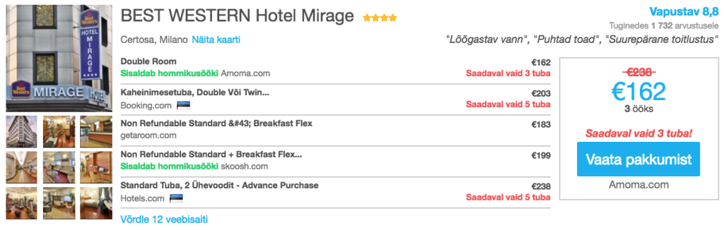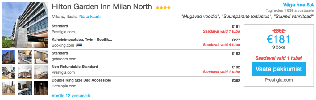 Hetkel on võimalik leida väga hea hinnaga lennupiletid Tallinnast Milanosse. Edasi-tagasi lennupiletid Tallinnast Milanosse veetmaks Milanos pikk nädalavahetus (N-P) on saadaval vaid 38€ eest. Pakkumine on tehtud kahele inimesele. Reisides kolmekesi või neljakesi, saab lennupiletid veelgi soodsamalt. Varakult ette broneerides leiab läbi HotelsCombined.ee ka väga hea hinnaga öömaja Milanos asuvates neljatärnihotellides Hilton Garden Inn või Best Western Hotel Mirage.